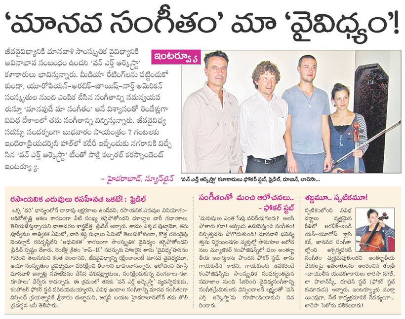 "Das Konzert des One Earth Orchestra war ein künstlerischer Beitrag auf der Biodiversitätskonferenz der Vereinten Nationen (COP 11) am 18. Oktober. .... Mit einem Programm aus europäischer, arabischer, indischer, japanischer und nordamerikanischer Musik verschiedener Epochen, mit Klangcollagen und "Witterungsinstrumenten", die von Umweltkräften gespielt werden, zeigten die Musiker des OEO eine begeisternde Auswahl der Musik und Klänge unserer Erde. .... Die Musik der Menschheit ist so vielfältig und entstammt doch einem gemeinsamen Kern, wie die sternförmigen Prismastrahlen eines Kristalls, betonen die Musiker. .... Das Programm zeigt eindringlich die enge Verbindung und gegenseitige Abhängigkeit von kultureller und biologischer Lebensvielfalt."
